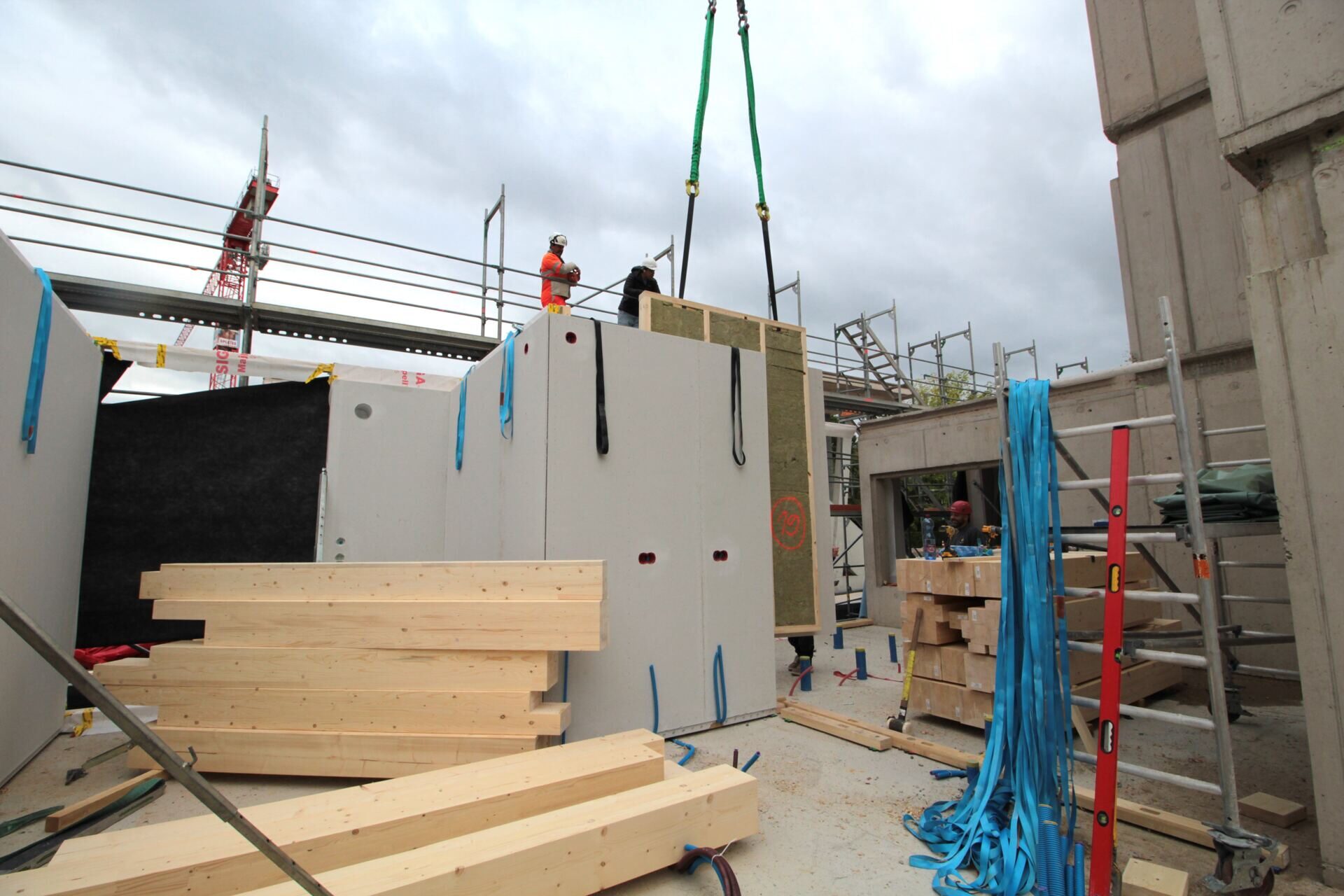 Wir sind am Aufrichten des 3. Mehrfamilienhauses an der Püntstrasse in Egg. Sämtliche Holzelemente wurden in unserer Halle 3 produziert. Die spannende Grossüberbauung entsteht in einer Arbeitsgemeinschaft mit Kübler AG Holzbau.