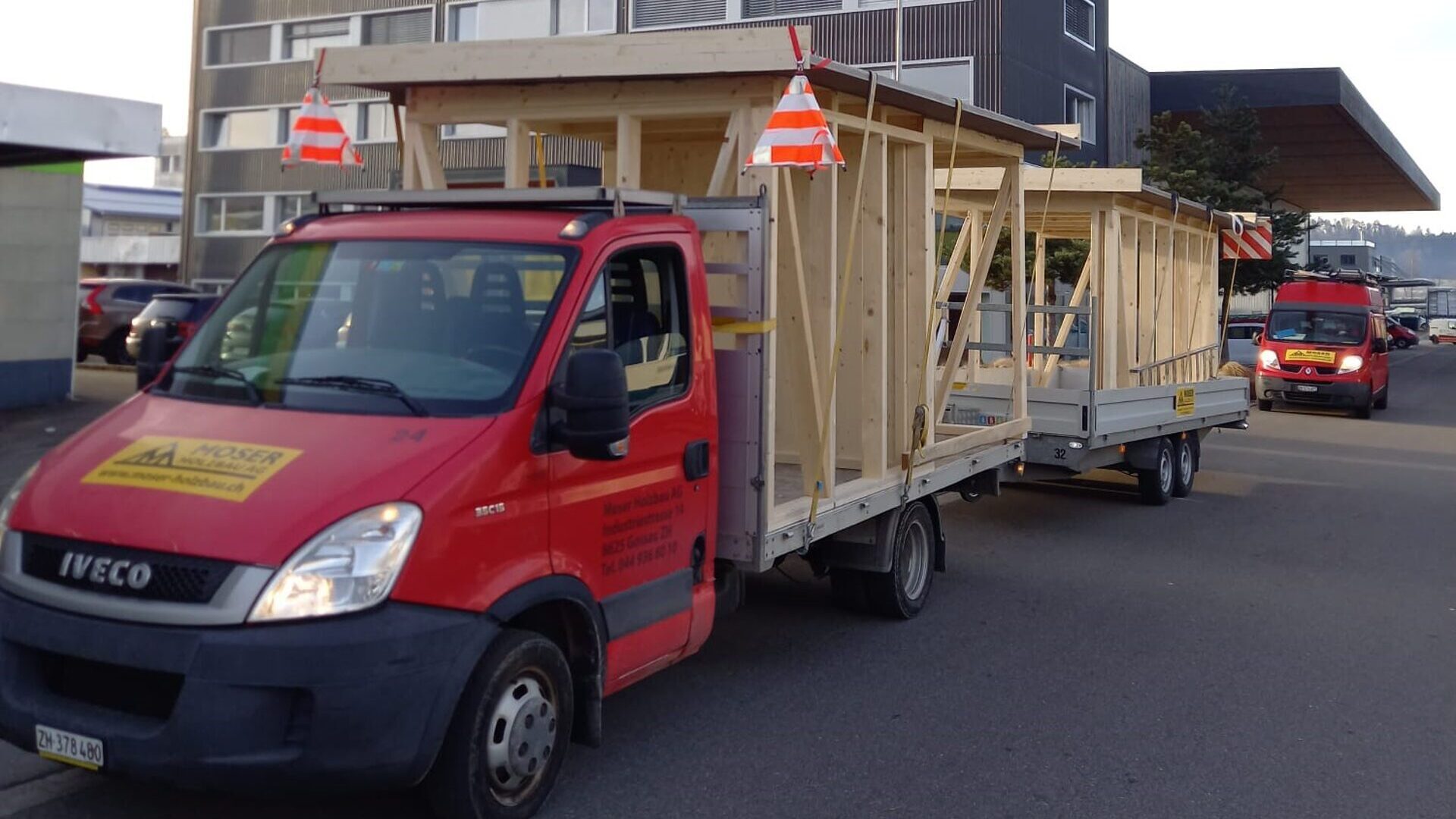 Die Geräte- und Veloschöpfe wurden in unserer Produktionshalle vorgefertigt. Dann konnten wir sie dank unserer Spezialbewilligung (Transport von Waren bis zu einer Breite von 3 m) selber nach Hinwil transportieren und mit einem Kran am endgültigen Ort abladen.