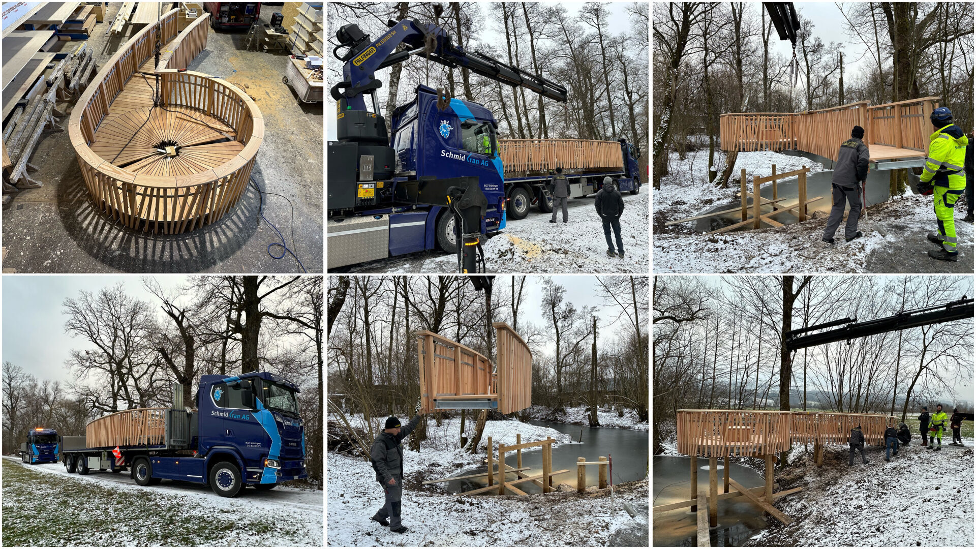 Der Holzsteg wurde in unserer Produktionshalle unter idealen Bedingungen vorgefertigt. Bei eisiger Kälte wurde er dann zum Aabach transportiert und dort innert kürzester Zeit montiert.