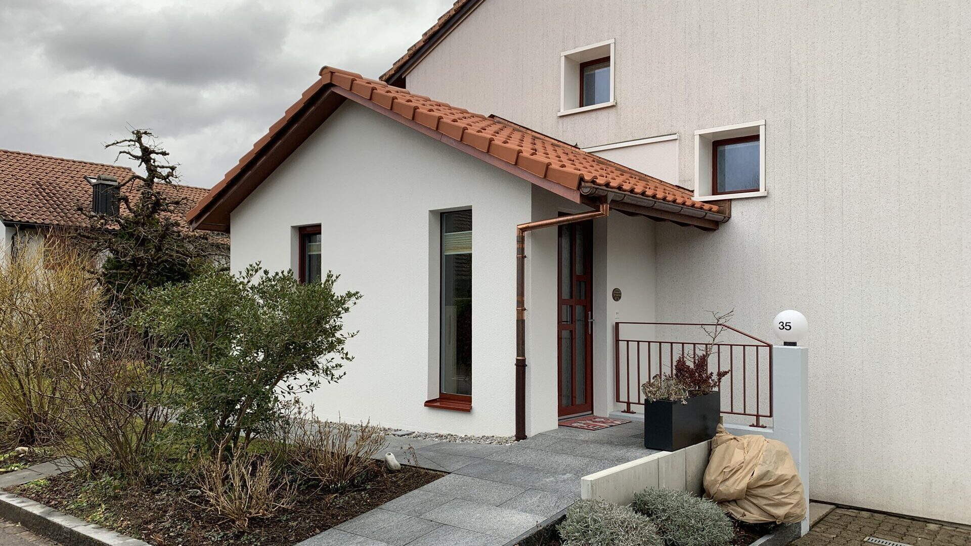 Der Eingangsbereich bei diesem Einfamilienhaus in Mönchaltorf wurde durch einen Anbau vergrössert. Wir durften die Zimmermannsarbeiten für das Schrägdach sowie den Innenausbau ausführen.