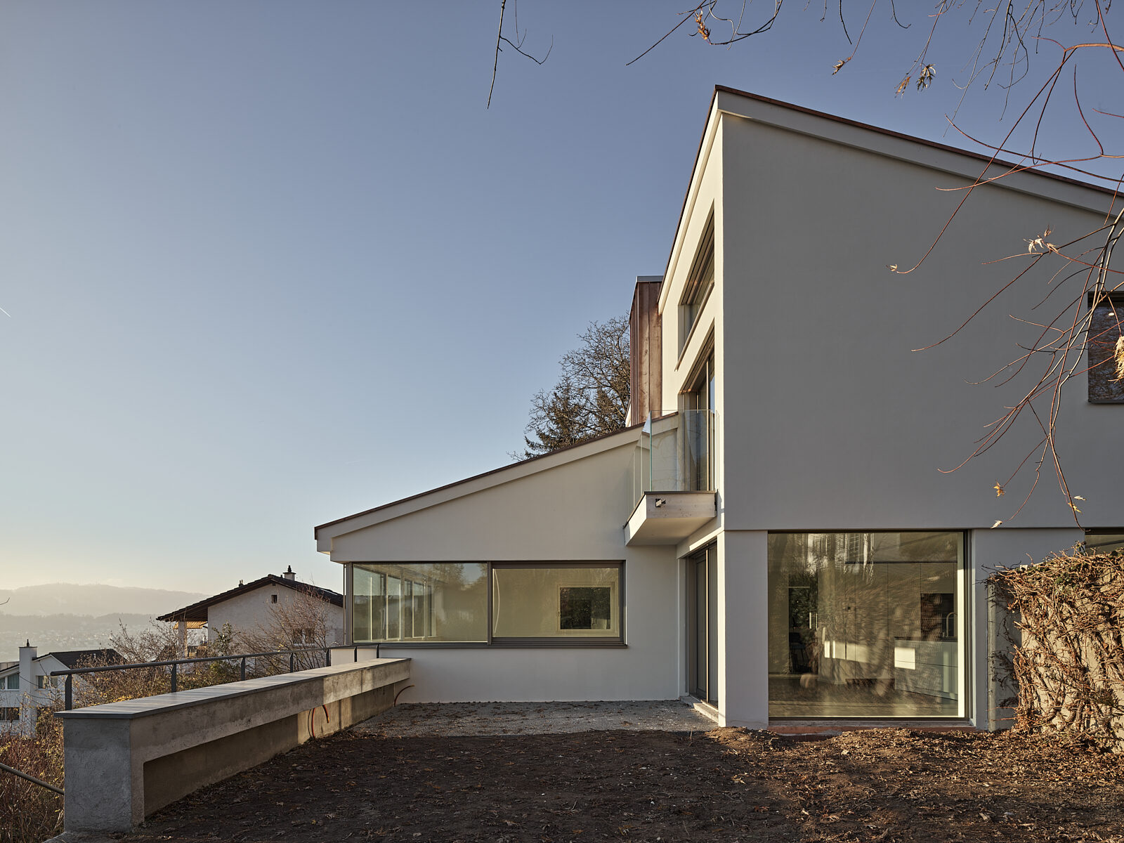 Das Dachgeschoss dieses Einfamilienhauses wurde abgebrochen und mit Holzelementen wieder aufgebaut. Damit wurde eine bessere Ausnutzung der Wohnfläche sowie ein hoher Standart der Dämmung und des Wohnklimas erreicht.