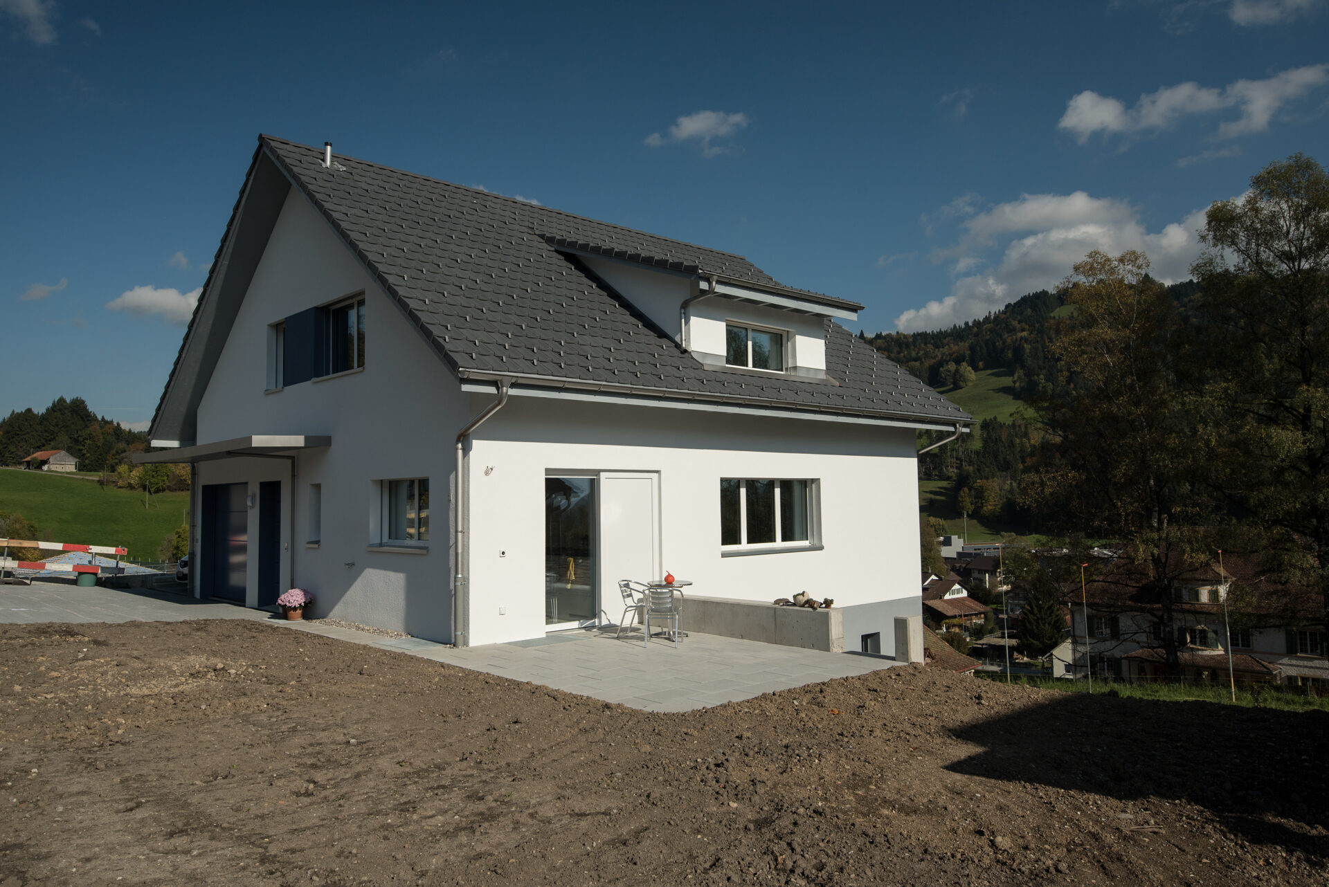 Wände, Decken, Böden und Dach wurden vorgefertigt, Fassade Vorplatz Weichfaserplatte verputzt