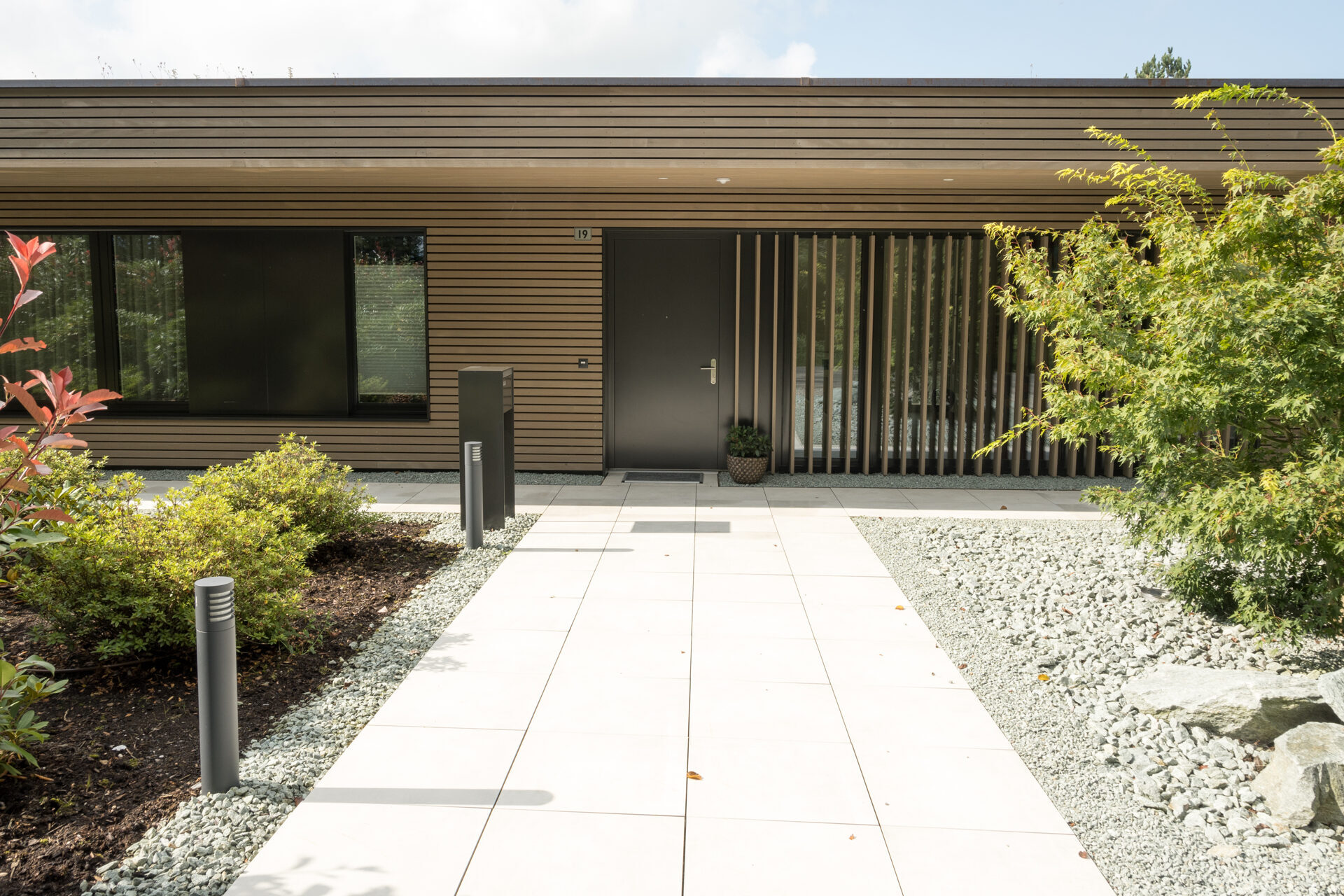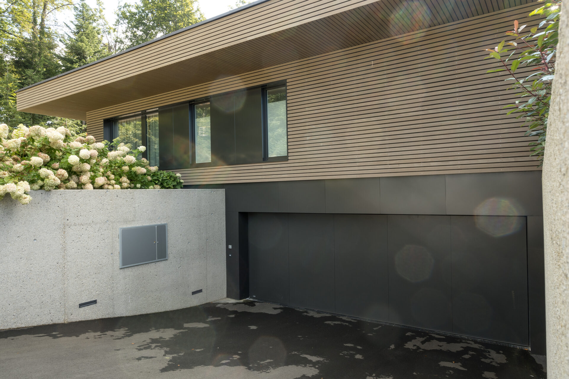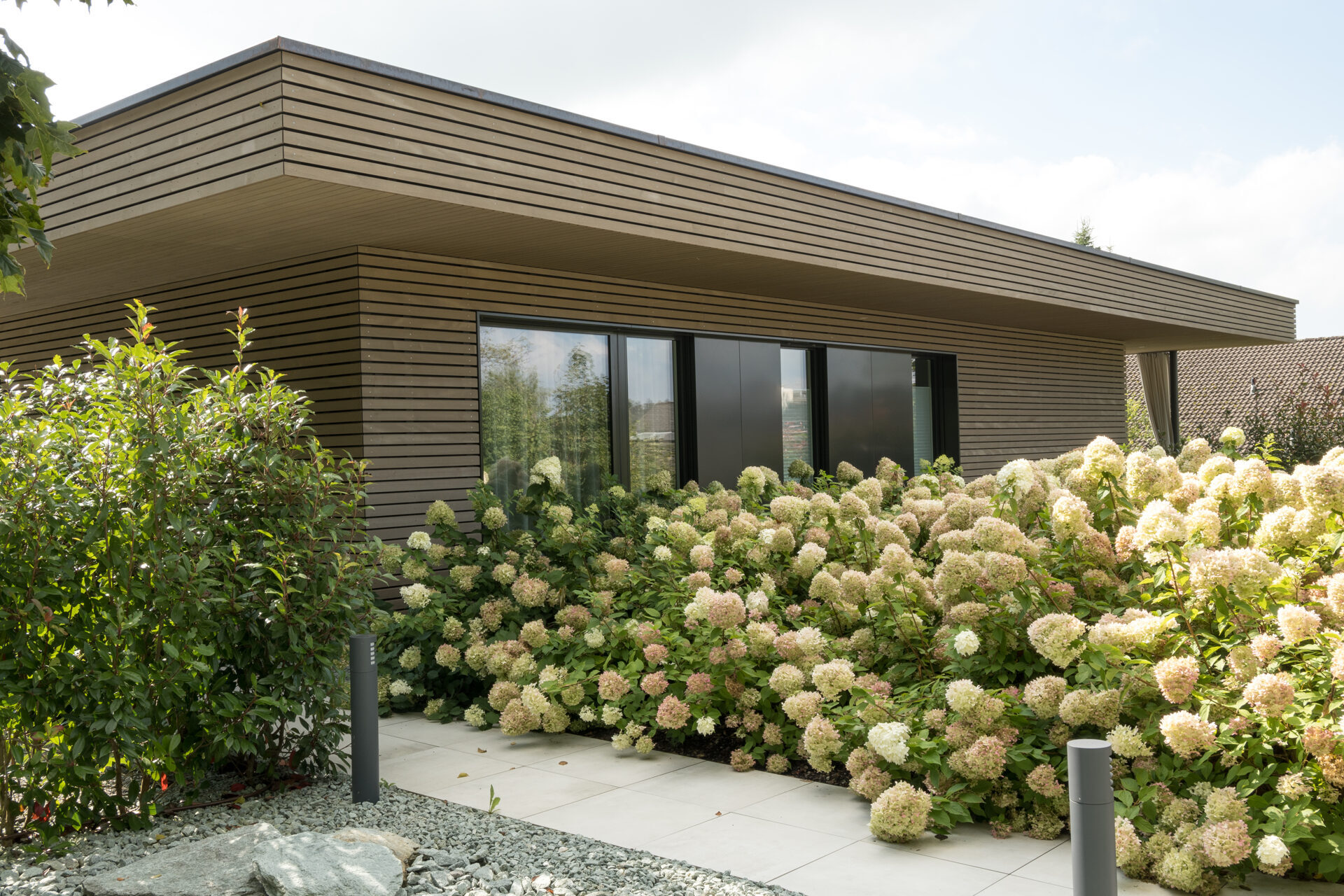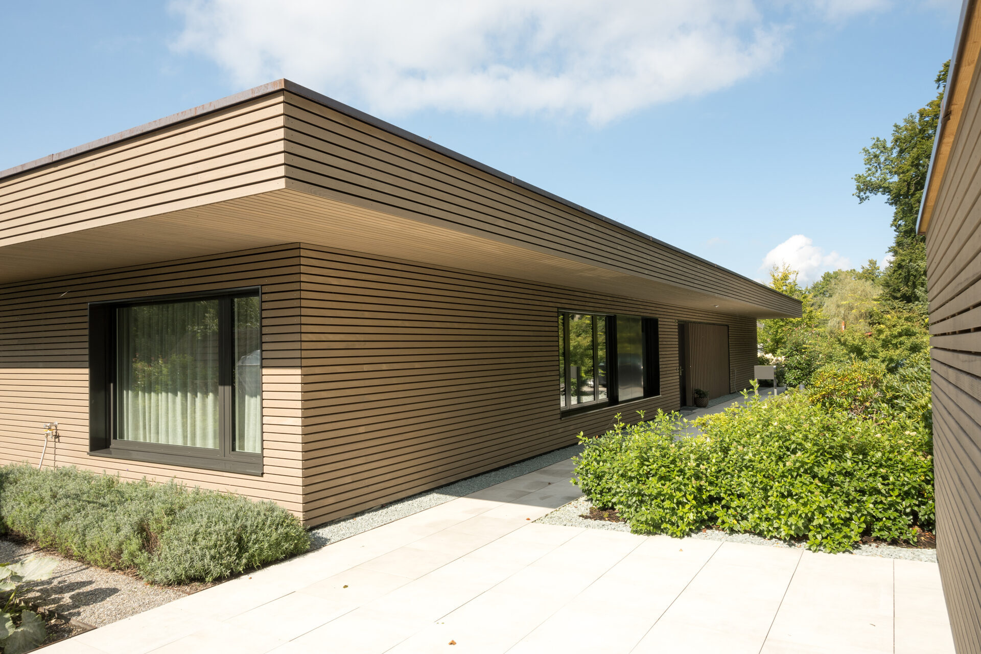 Ein spezielles Augenmerk verdient die Holzfassade aus Tanne: Sie wechselt mit unterschiedlichen Farbtönen von einer horizontalen Fassade zur Decke.