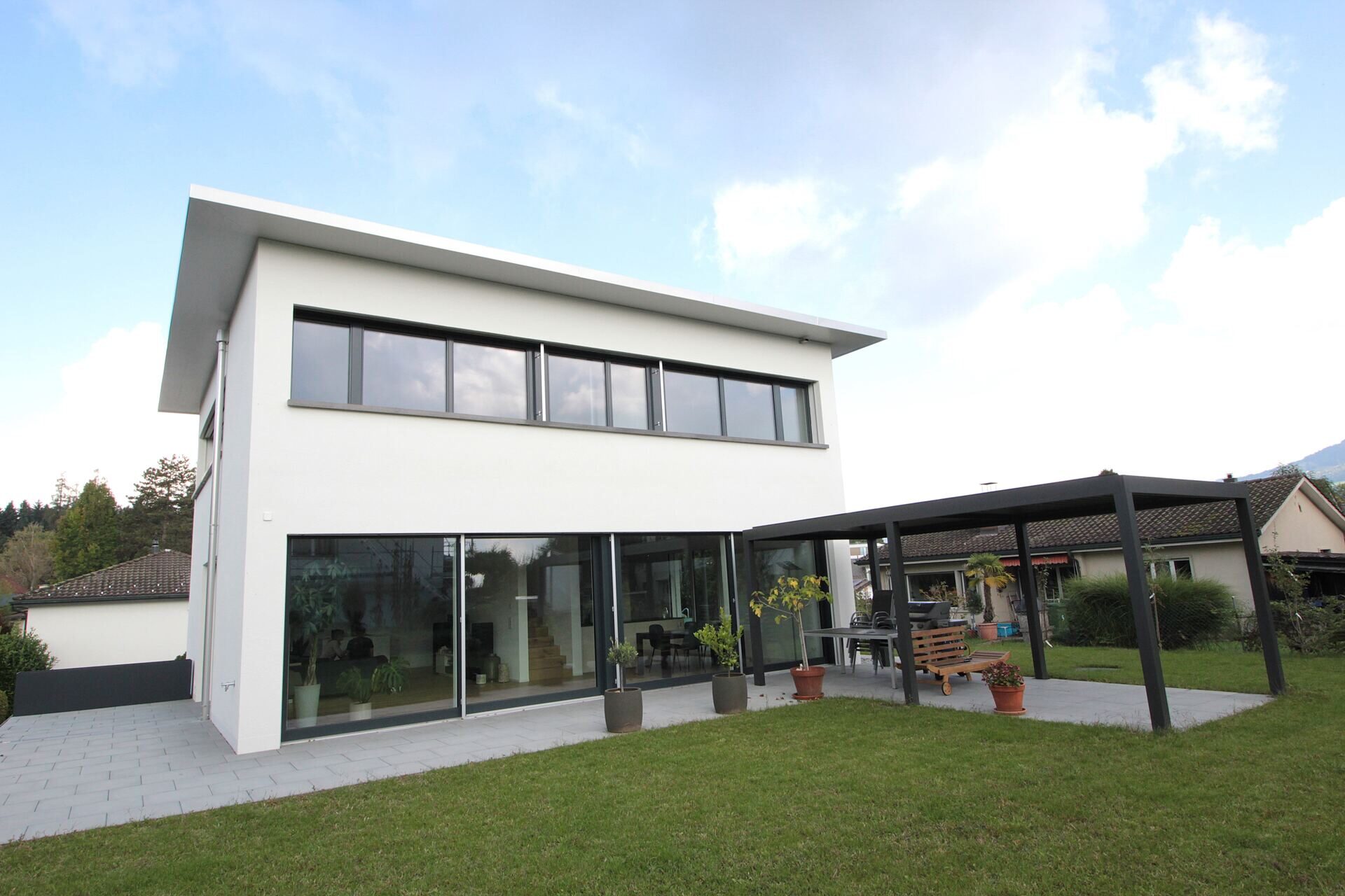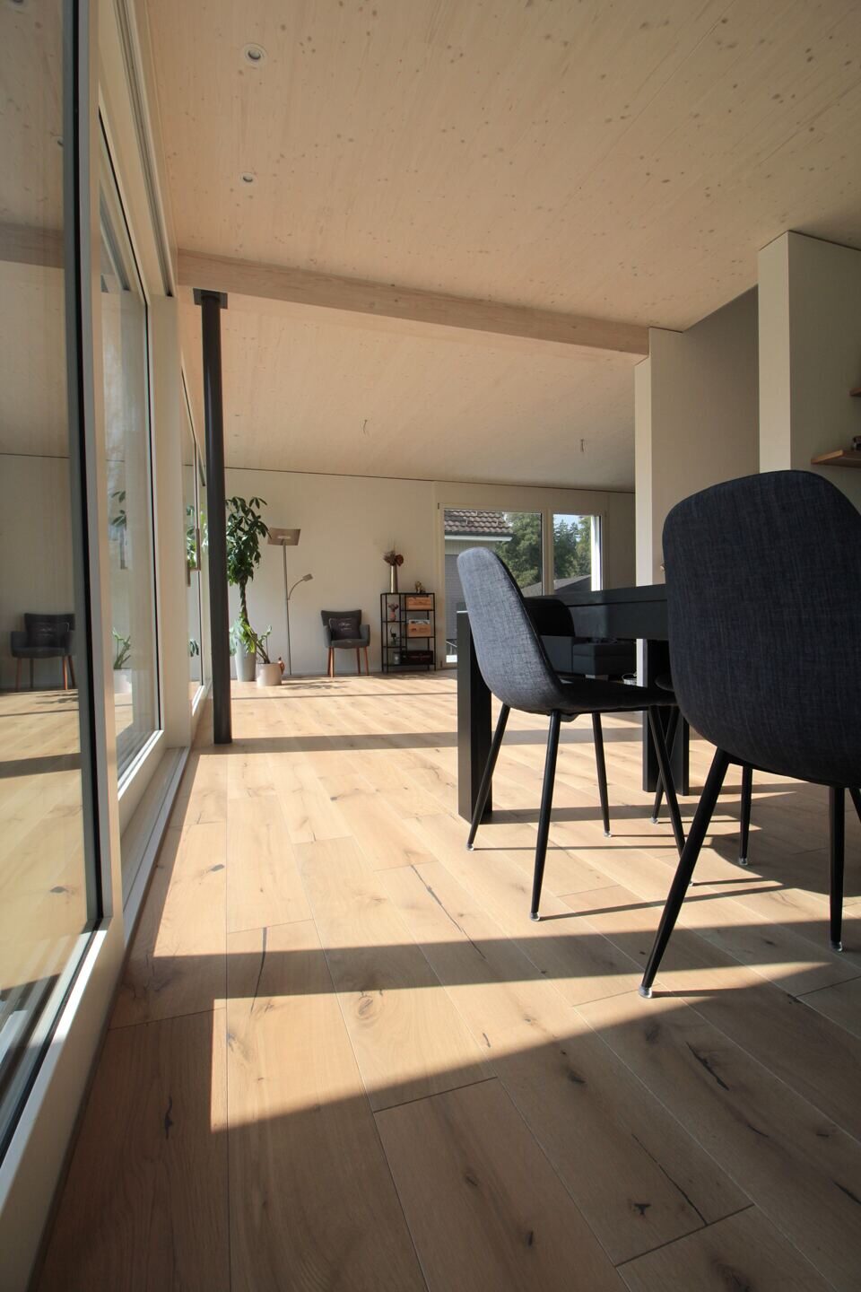 Holzelementbau mit verputzter Holzweichfaserplatte aussen, Sichtdecken, Treppe: Fachplanung, Montage- und Aufrichtearbeiten, Aussenwände EG & OG, Innenwände EG & OG, Fensterbänke aussen, Geschossdecke und Flachdach, Dachrand, Flachdachausstieg, Treppe EG/OG