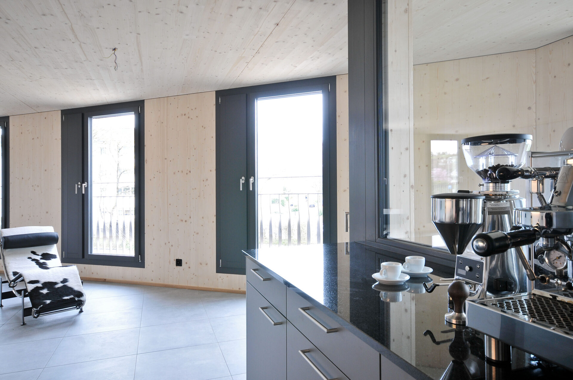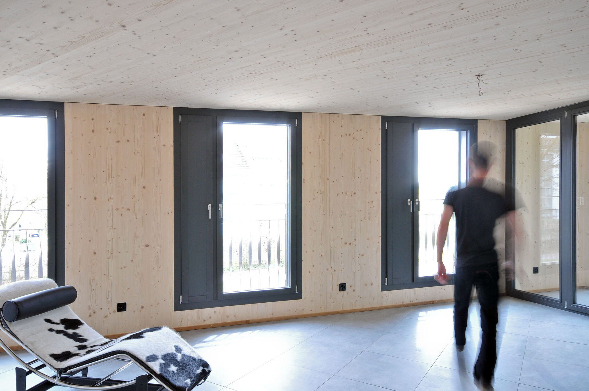 Mehrgeschossiges Mehrfamilienhaus, komplett im Holz-Elementbau erstellt, Wohnungsdecken und Aussenwände innen in Fichteholz sichtbar