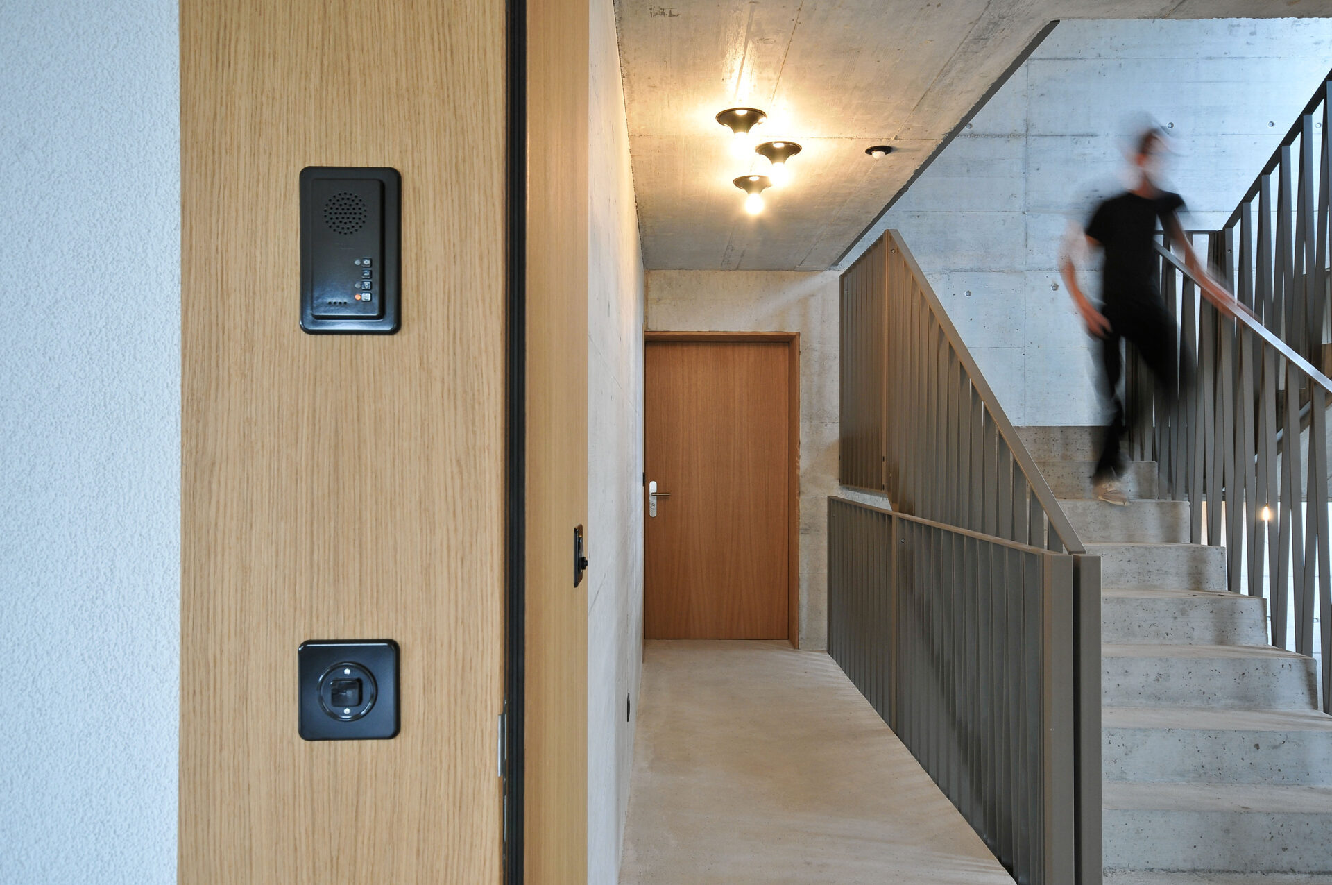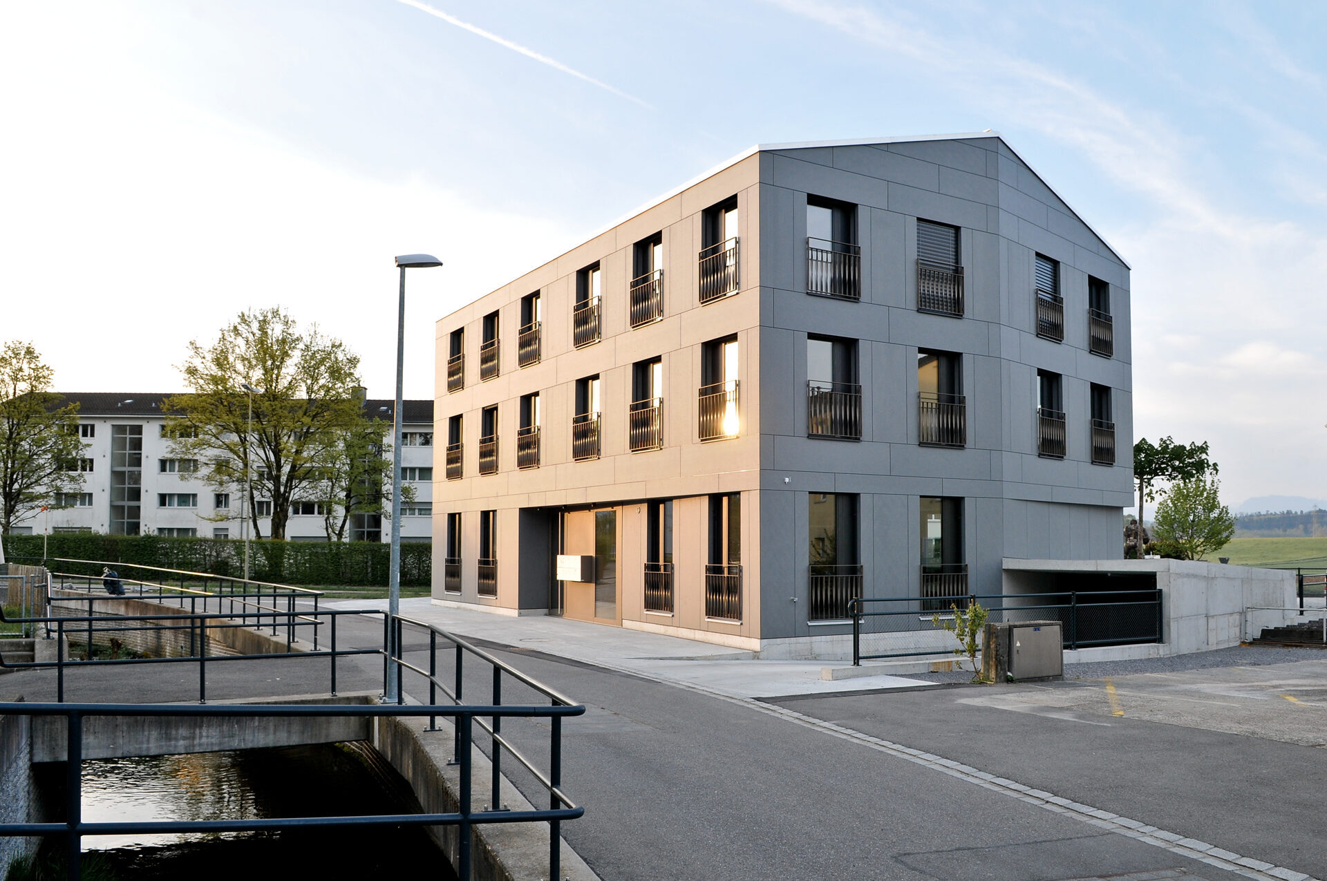 Elementbau aus Holz, Treppenhaus aus Stahlbeton Sicht, Fassade aus Eternit Grossformat