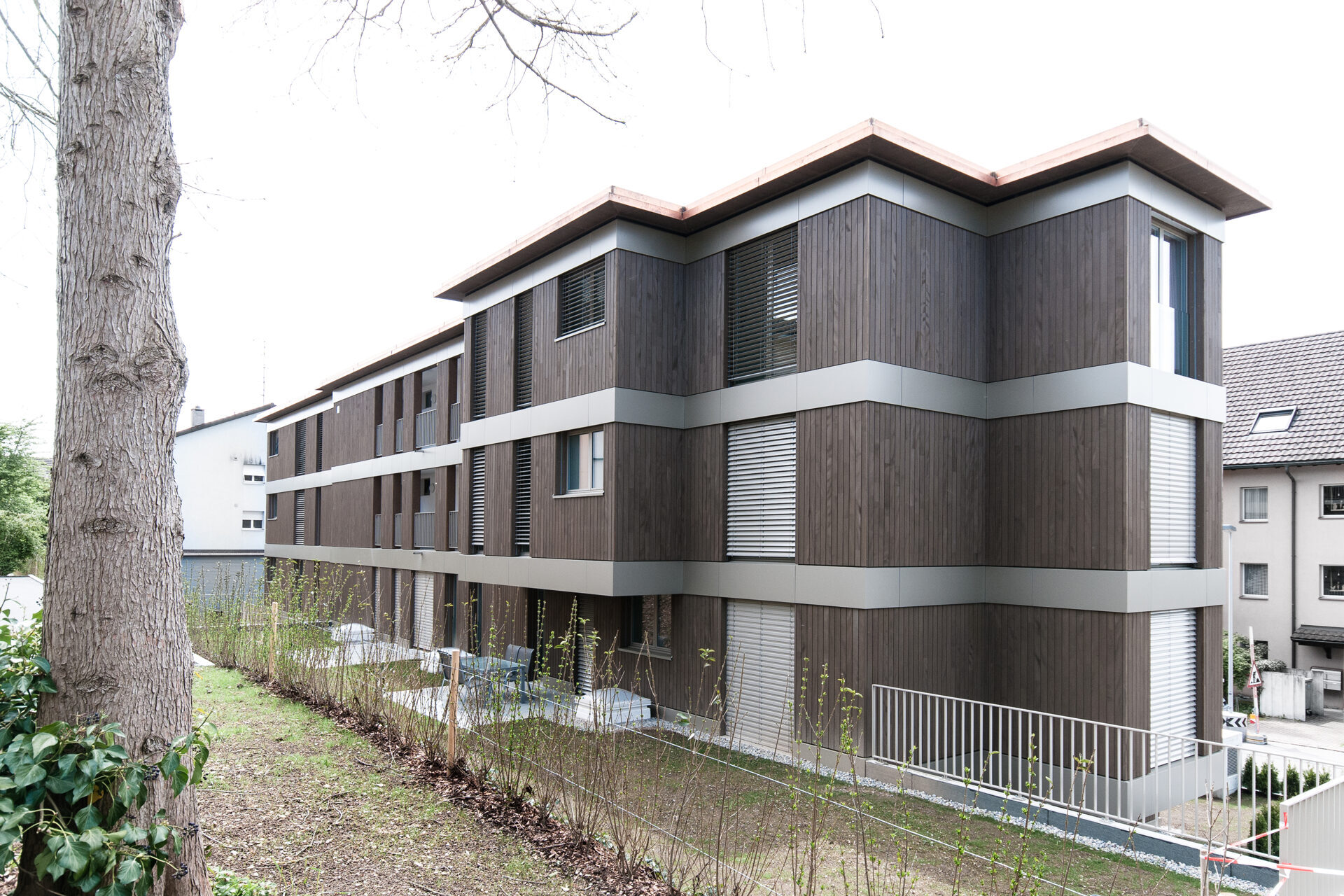 4-geschossiges Mehrfamilienhaus mit 12 Wohnungen, Fassade in Holz und Aluminium Verbundplatte, Prefa