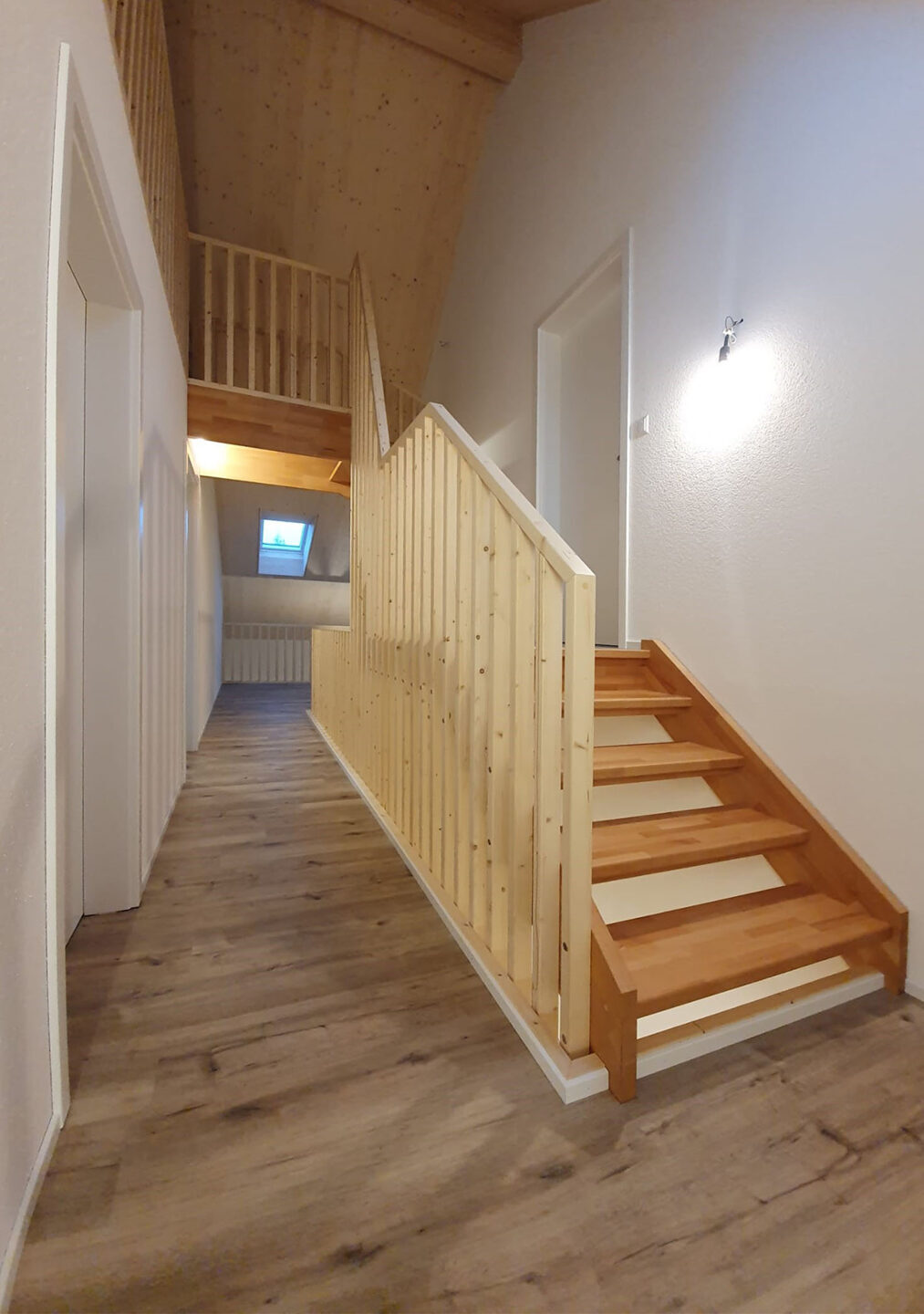 Treppe mit Galerie in Buchenholz, Geländer in Fichtenholz